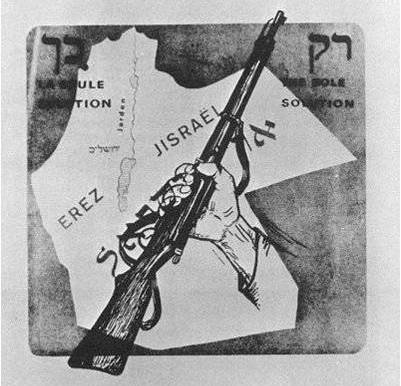 An Irgun poster from 1931 showing a map labelled “Land of Israel” covering the borders of both Mandatory Palestine and the Emirate of Transjordan, which the Irgun claimed in their entirety for a future Jewish state – Public Domain